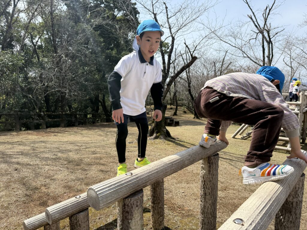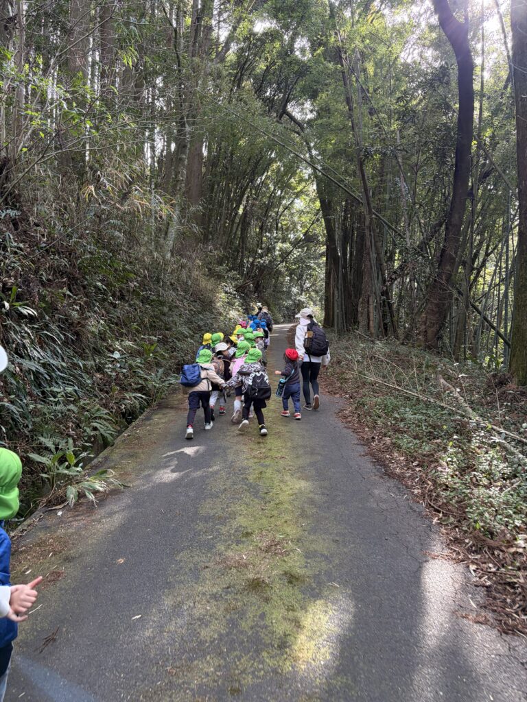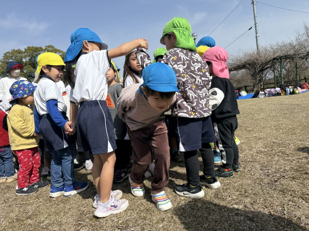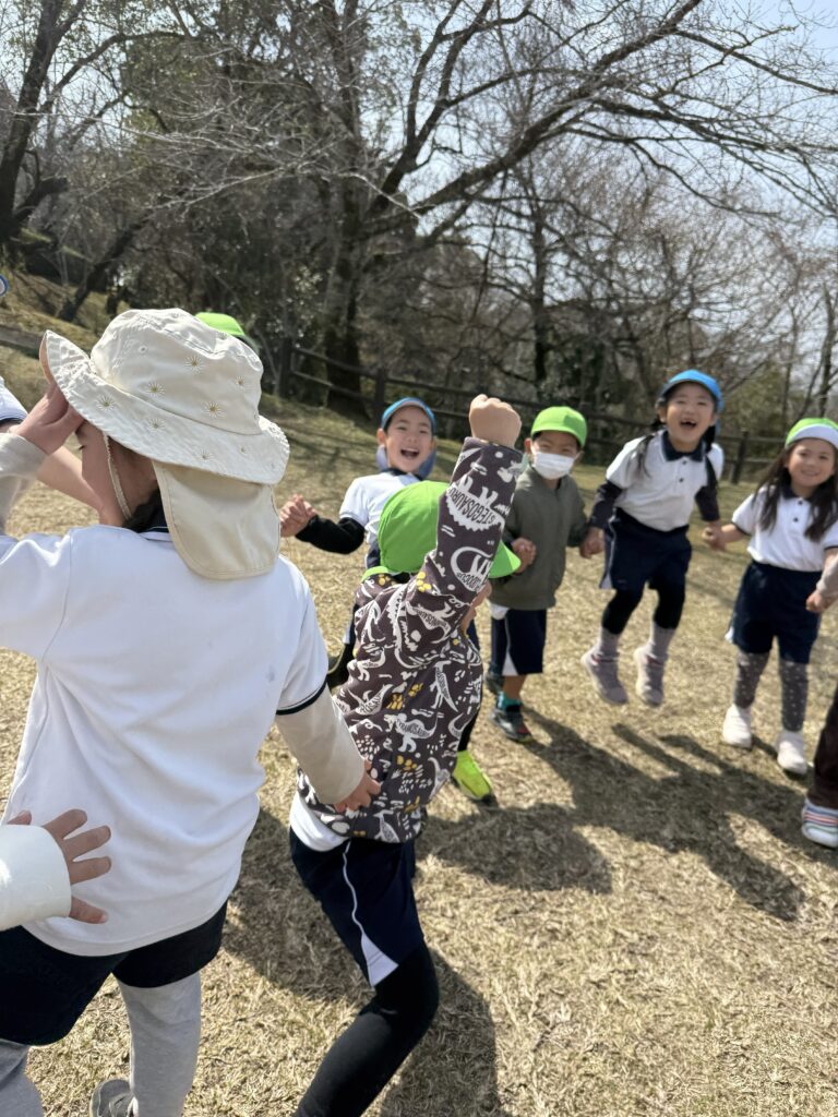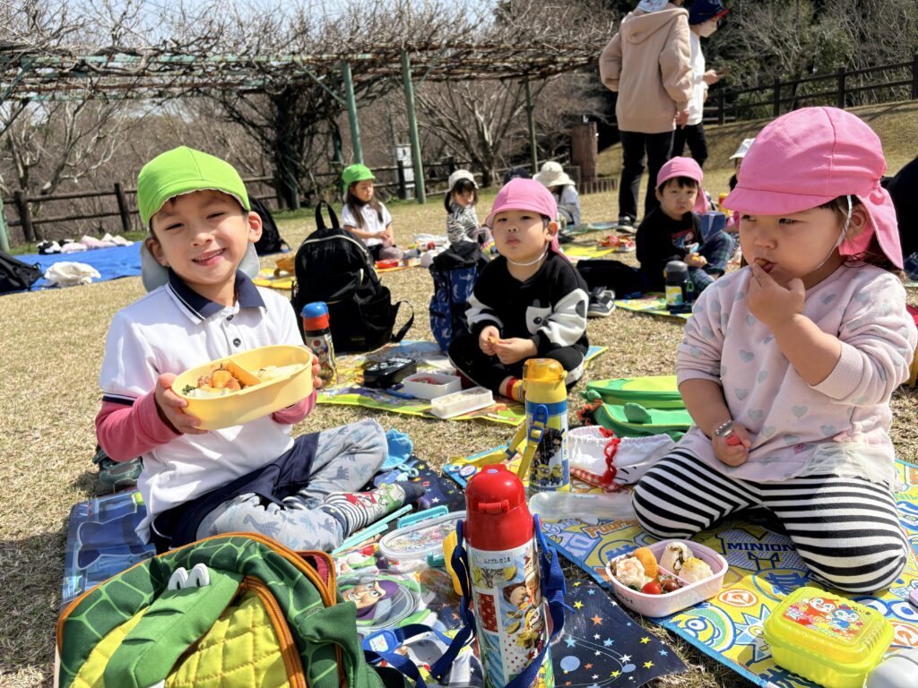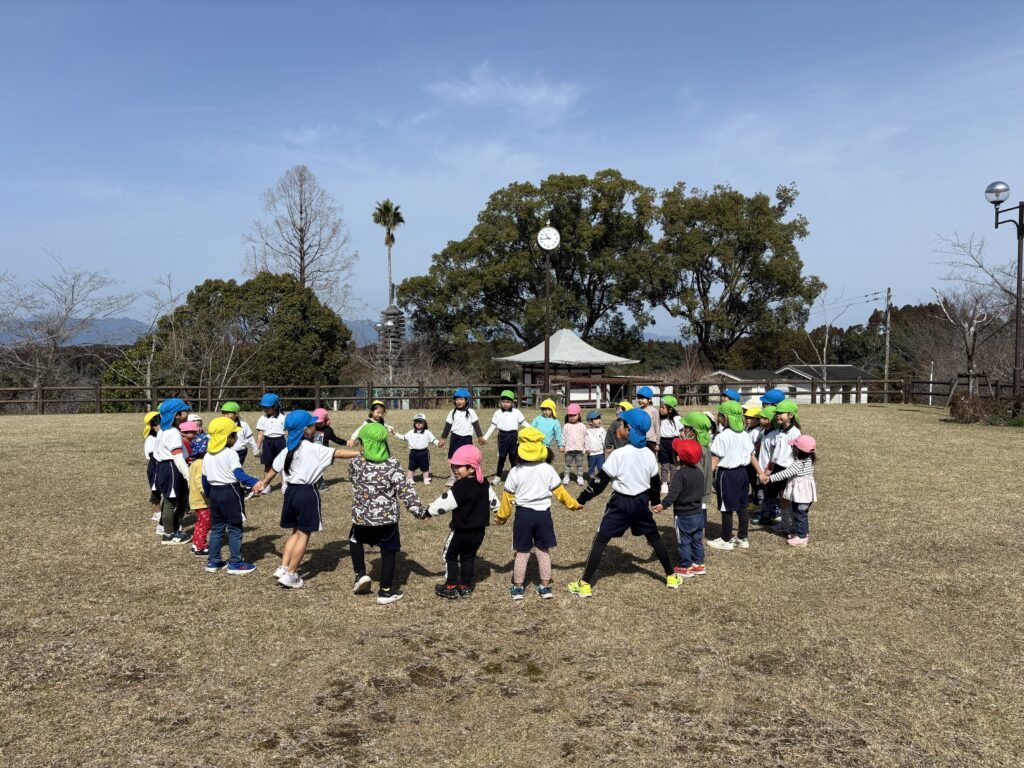 『お別れ遠足』 1歳児から5歳児まで歩いて、垂水公園にお別れ遠足に行きました。園から垂水公園までの道のりは1.8キロ。朝は少し冷えましたが、つく頃には日差しが射し暖かくなりました。途中満開の菜の花畑を見たり、ウグイスの鳴き声を聞き、春の訪れを感じることができました。みんなでわらべうたゲームをし、愛情たっぷりのお弁当を輪になって食べてました。年長さんと手を繋ぐのも、お弁当を食べるのも、最後の遠足。素敵な思い出ができました。