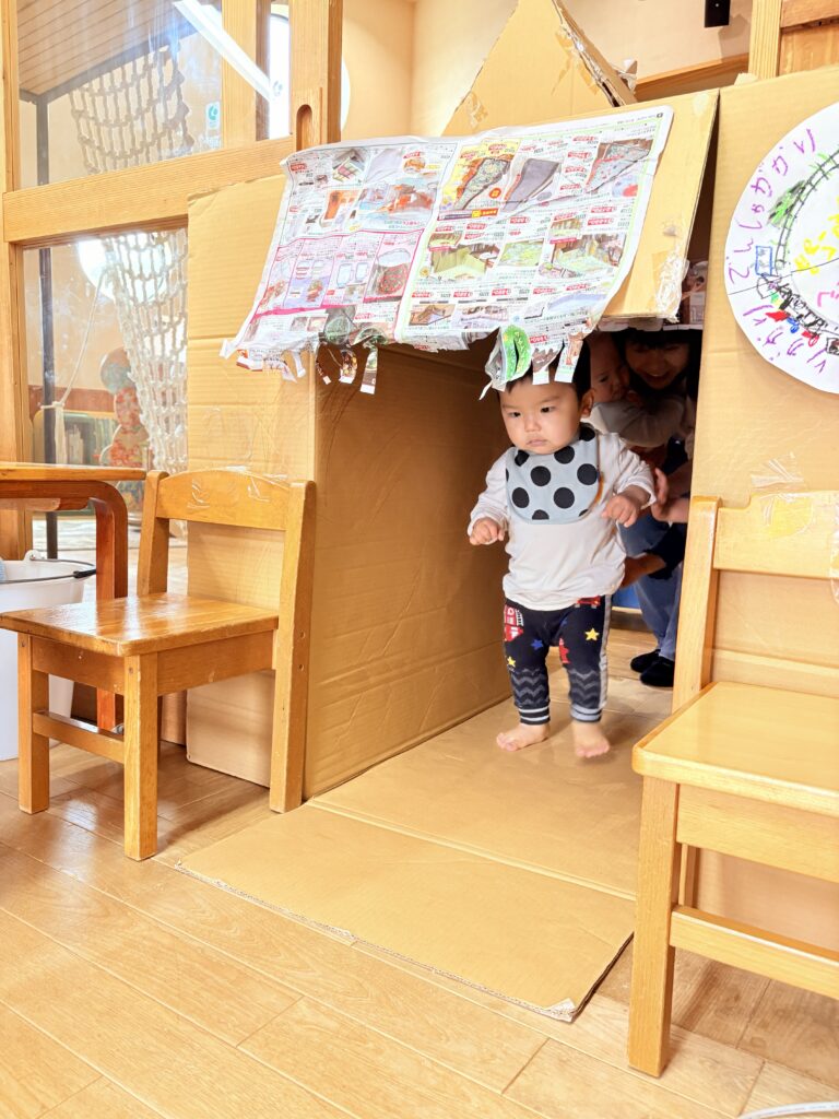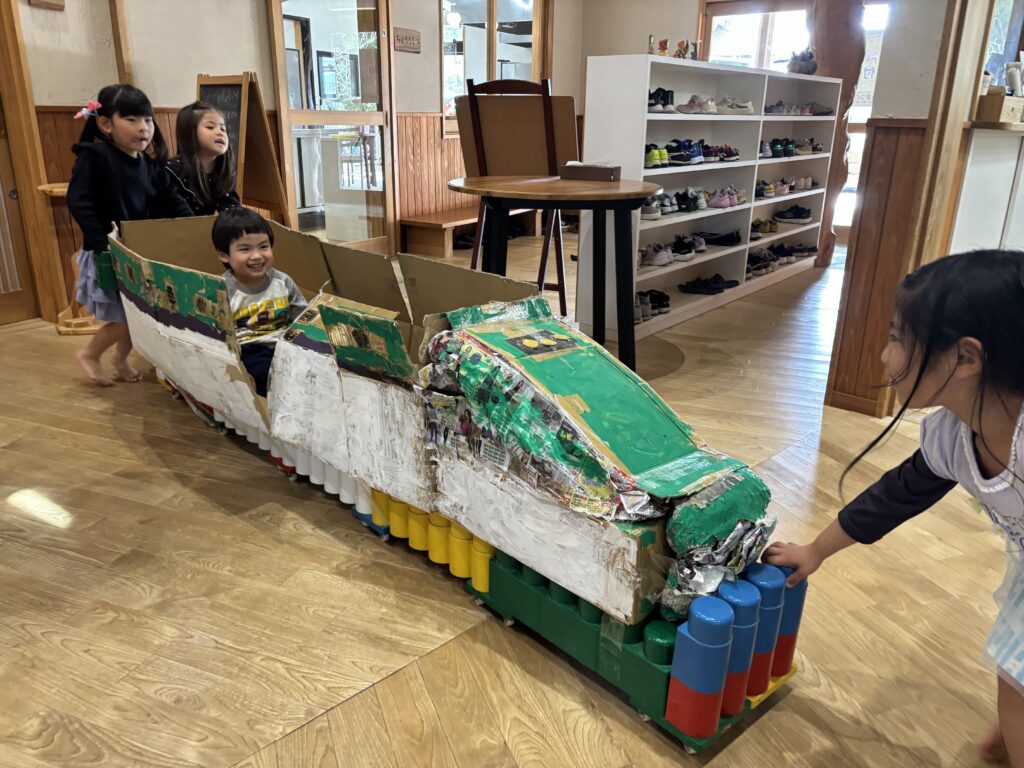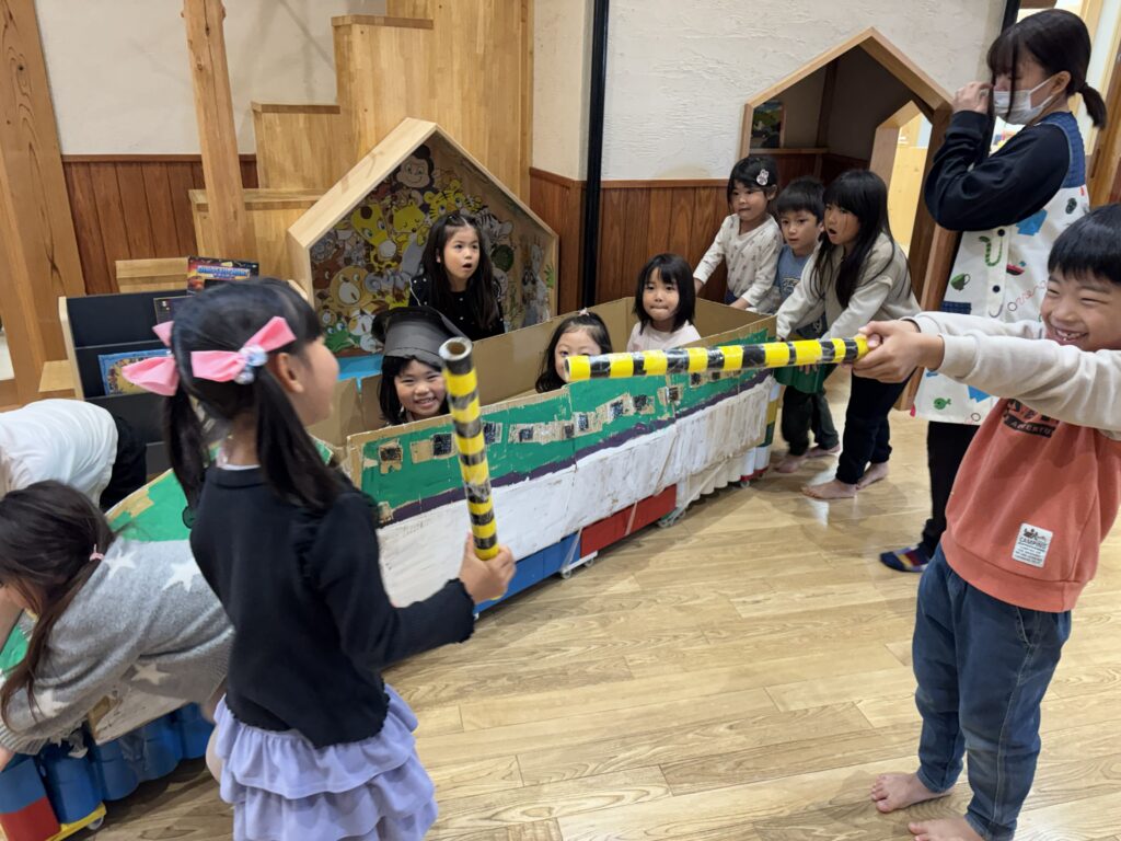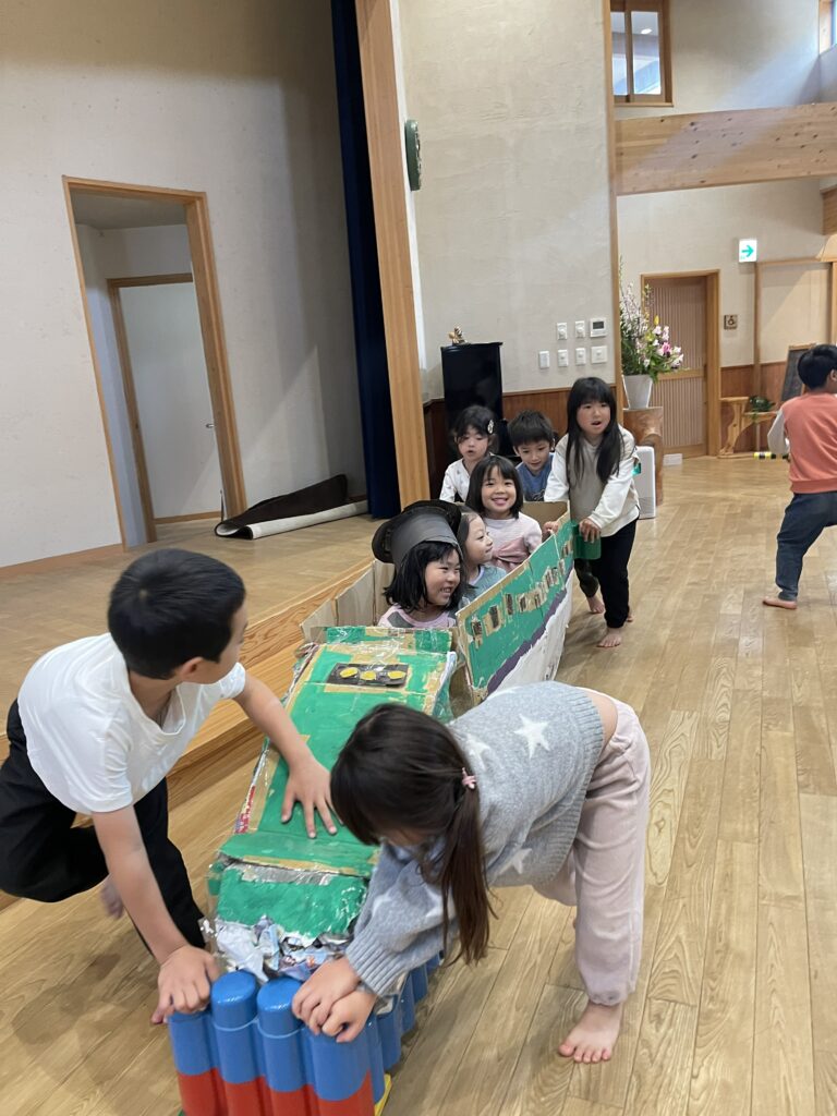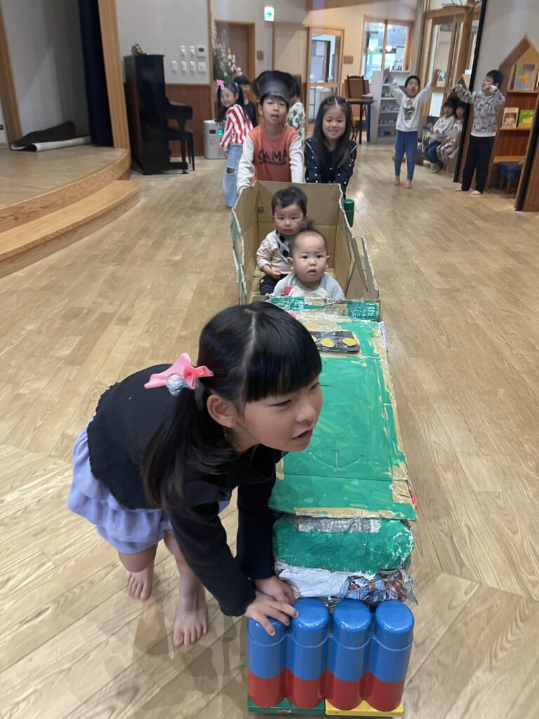 きりん組(4.5歳児)さんが計画した「ぽっぷあっぷ・はやぶさセンター」という名のお楽しみ会。自分たちで制作した「はやぶさ」に、みんなを乗せてあげたい!という思いから始まりました。「お部屋を駅にしよう」「踏切がいるね」「駅弁も作ろう」「お土産も作ろう」と次から次に子どもたちの話は膨らんでいきました。しっかりと準備とリハーサルをし、いよいよお客さんを招待する日。切符をもらい待合所で待ちます。0歳児さんから順番に新幹線に乗車し、手動で進みます。それからお土産屋さんに誘導され、手作りの駅弁を選び、お会計時はビニール袋に駅弁を入れてくれました。タッチ決済!手と手を「タッチ!」としてのお会計でした。みんなを笑顔にさせ、喜ばせてくれました。次のご招待を楽しみにしています。