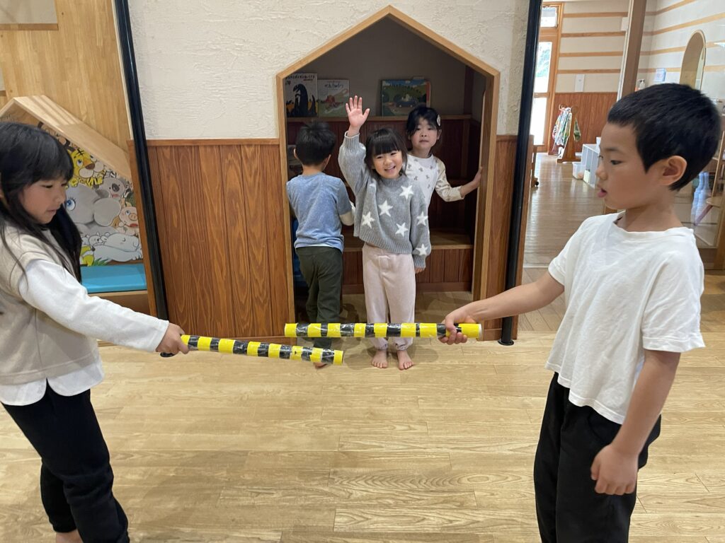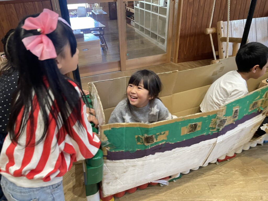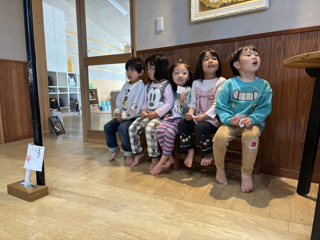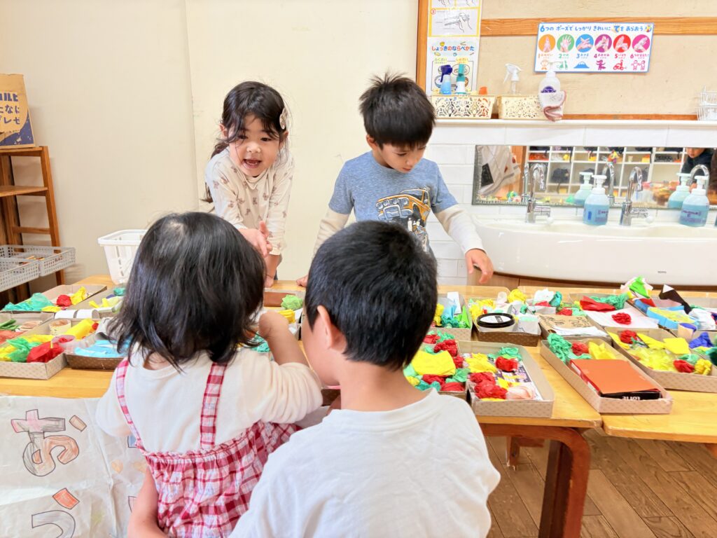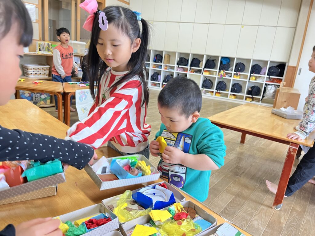 きりん組(4.5歳児)さんが計画した「ぽっぷあっぷ・はやぶさセンター」という名のお楽しみ会。自分たちで制作した「はやぶさ」に、みんなを乗せてあげたい!という思いから始まりました。「お部屋を駅にしよう」「踏切がいるね」「駅弁も作ろう」「お土産も作ろう」と次から次に子どもたちの話は膨らんでいきました。しっかりと準備とリハーサルをし、いよいよお客さんを招待する日。切符をもらい待合所で待ちます。0歳児さんから順番に新幹線に乗車し、手動で進みます。それからお土産屋さんに誘導され、手作りの駅弁を選び、お会計時はビニール袋に駅弁を入れてくれました。タッチ決済!手と手を「タッチ!」としてのお会計でした。みんなを笑顔にさせ、喜ばせてくれました。次のご招待を楽しみにしています。