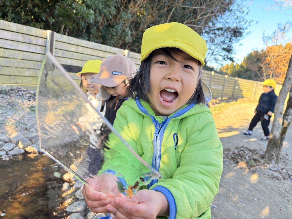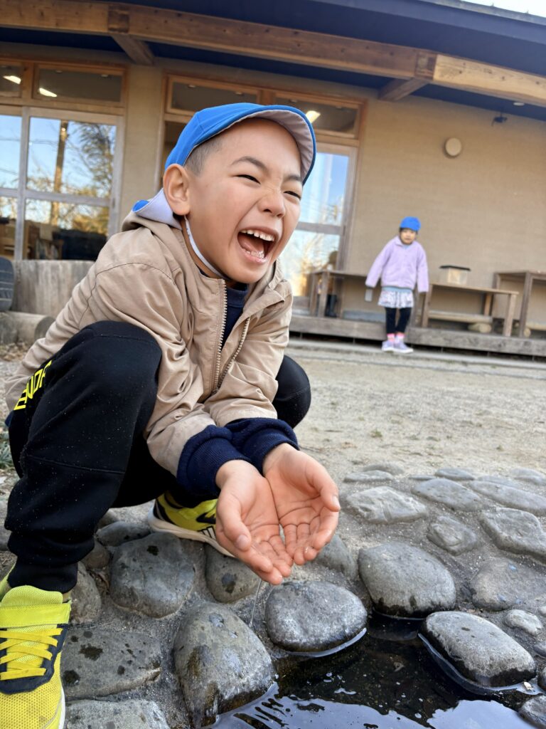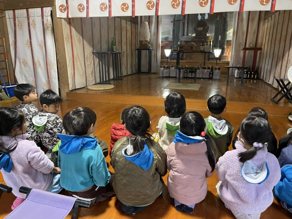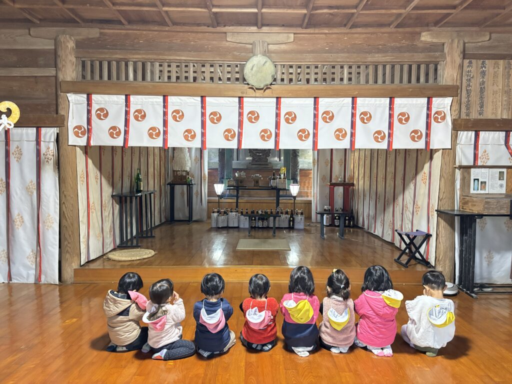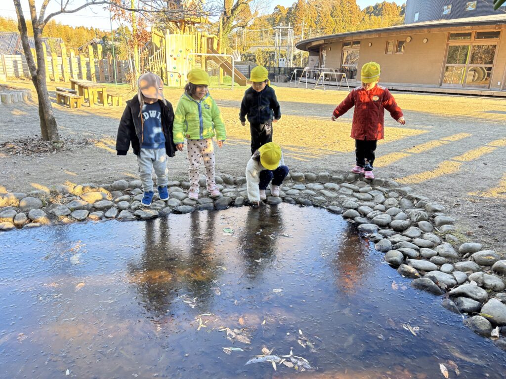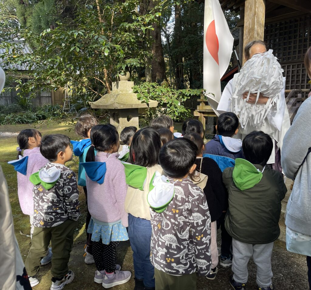 『お正月』 新しい年が始まり、園舎に子どもたちの元気な声が戻ってきました。保育初めの日に、神社にお詣りに行きました。新年の挨拶と共に「今年一年元気に過ごせますように。見守っていてください」と神様に手を合わせました。今年も一年良い年でありますように。ようやく冬らしい寒さが訪れ、園のお池にも氷が張るようになりました。毎朝、「氷できてるかな?」とお池を覗き、寒さのレベルを判断している子どもたちです。