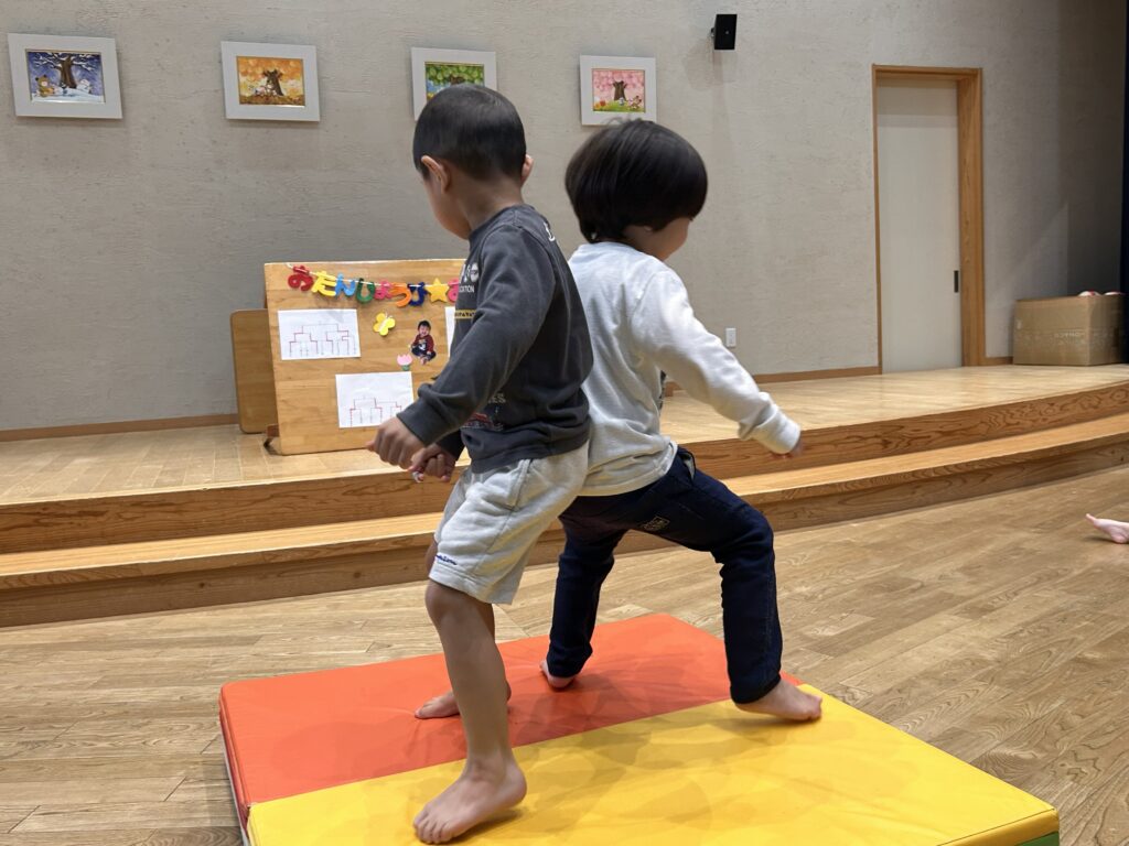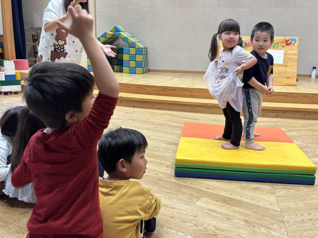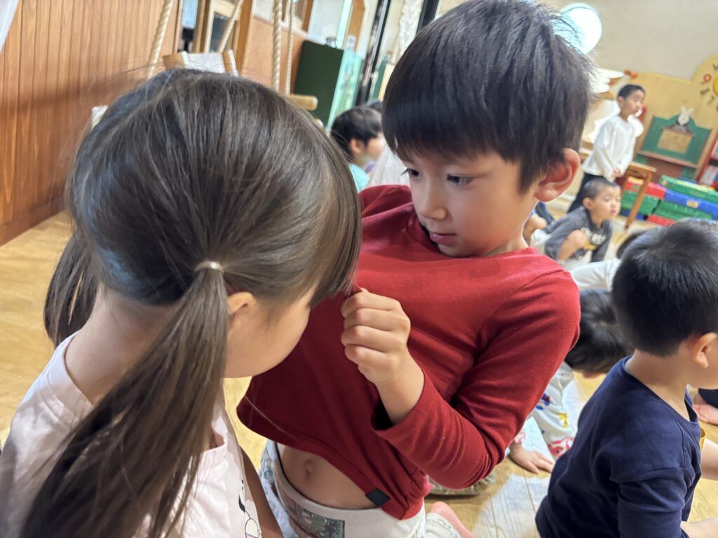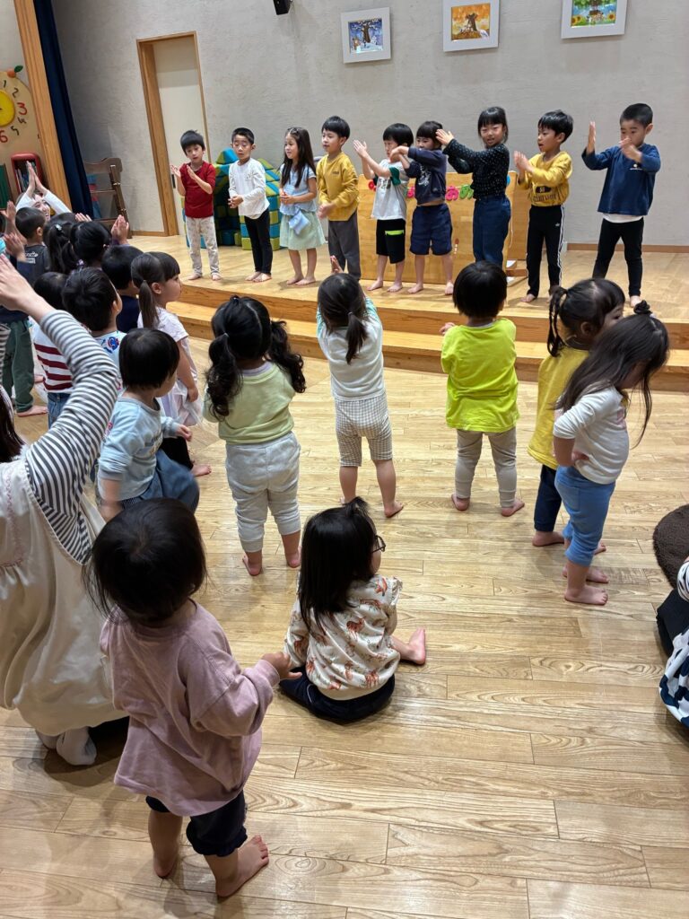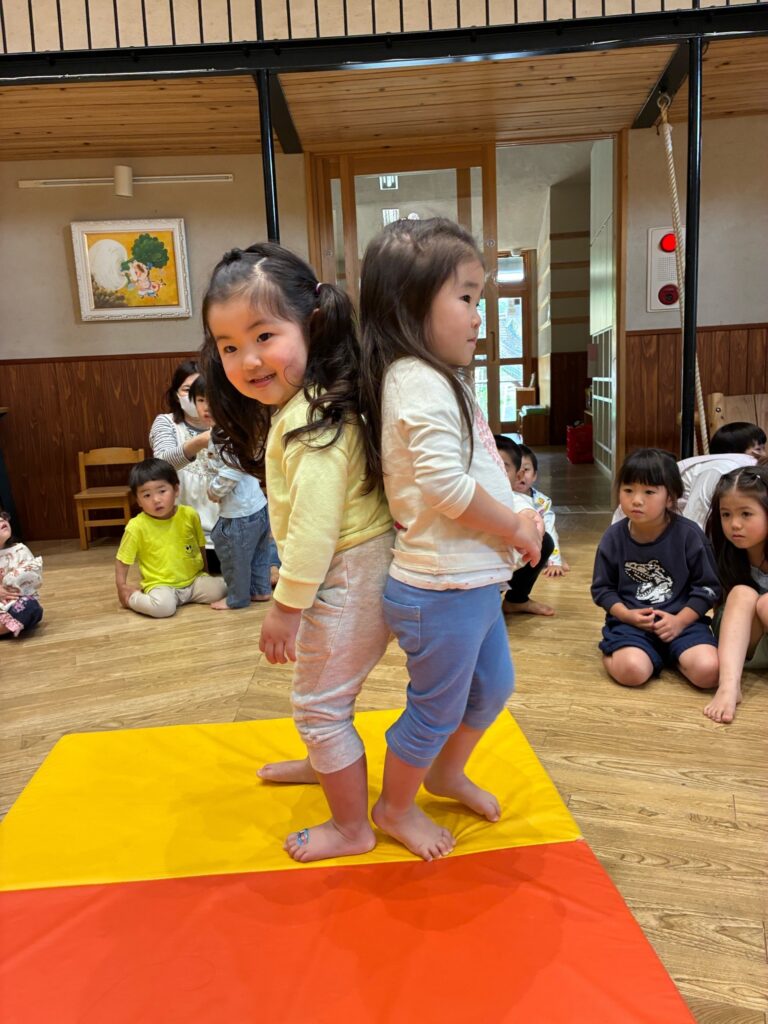 『お誕生会』 4月生まれのお友だちのお誕生会でした。季節の歌をみんなで歌いながら踊りました。ペープサートなどを楽しみ、「お尻相撲大会」が行われました。お尻とお尻を合わせて踏ん張って踏ん張って戦いました。勝って喜ぶ子も入れば、悔し泣きをする子もいます。悔し涙を流しているお友だちを見て、とっさに自分の洋服で拭いてあげる優しい姿がありました。誕生会恒例の園長先生のマジックショーでは、成功しますようにと、祈りながら見守る姿もあり、ほっこりとした気持ちになったお誕生会でした。