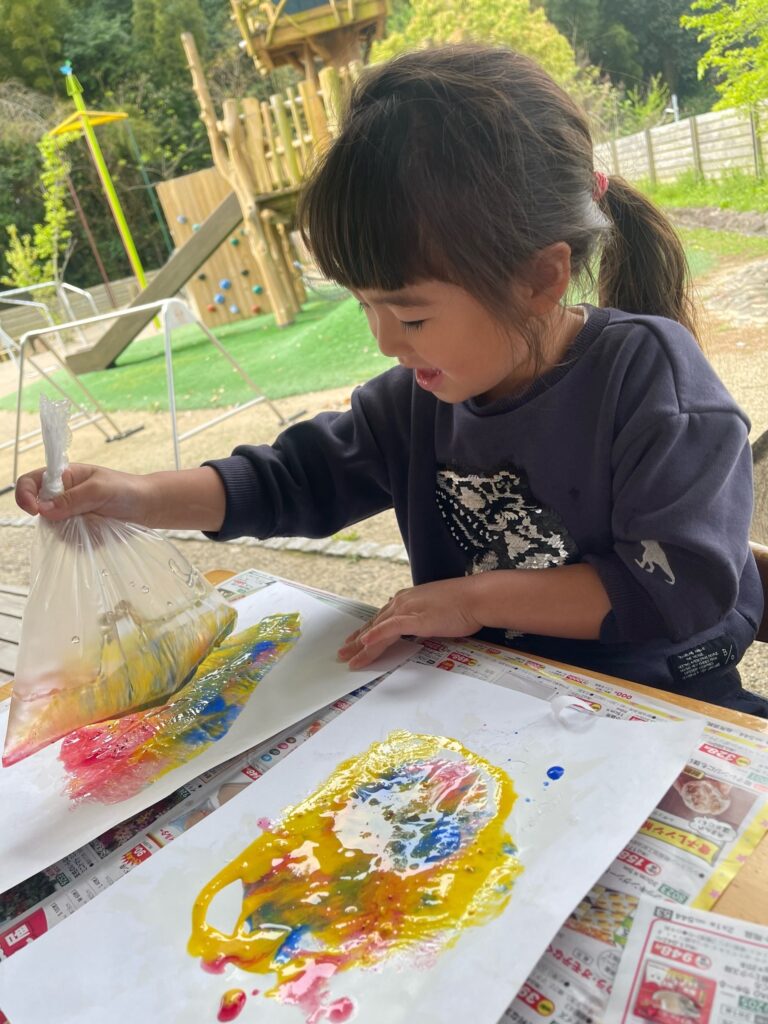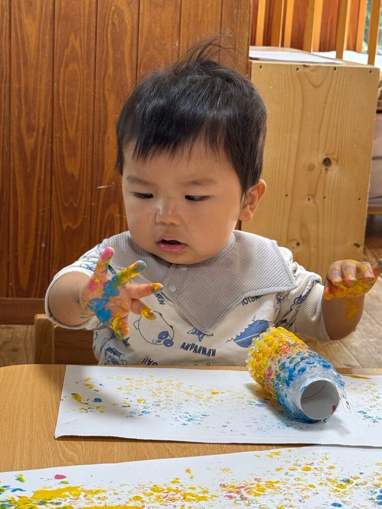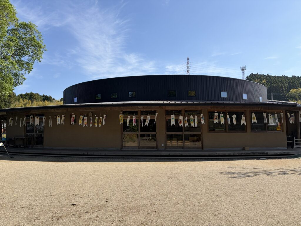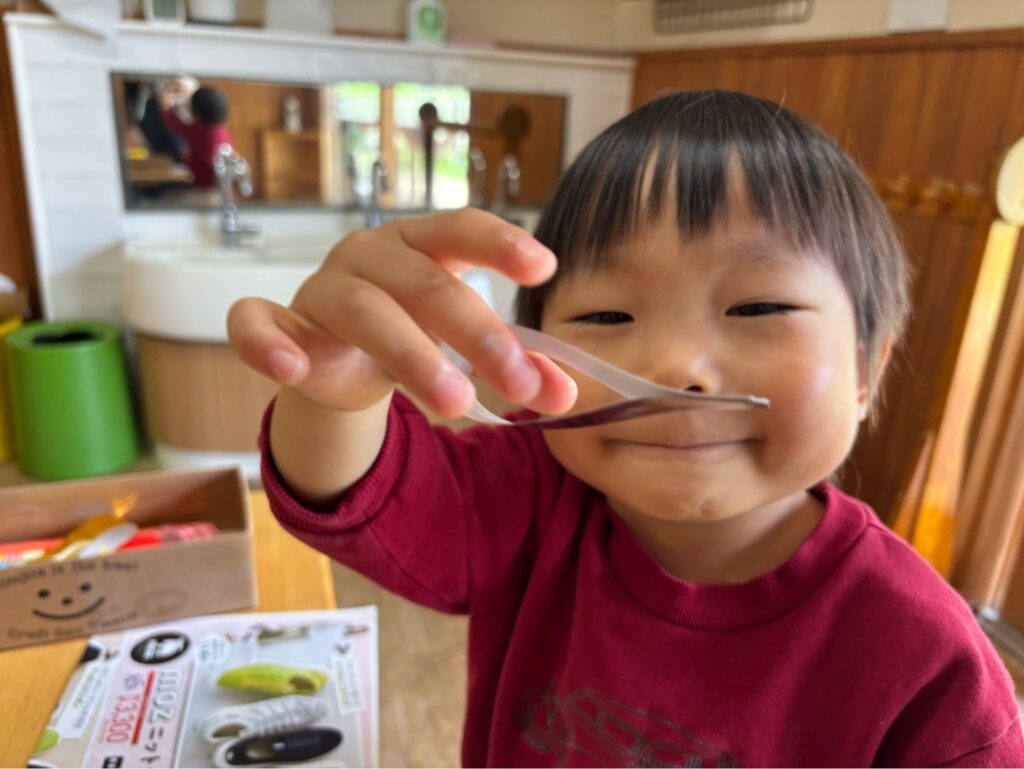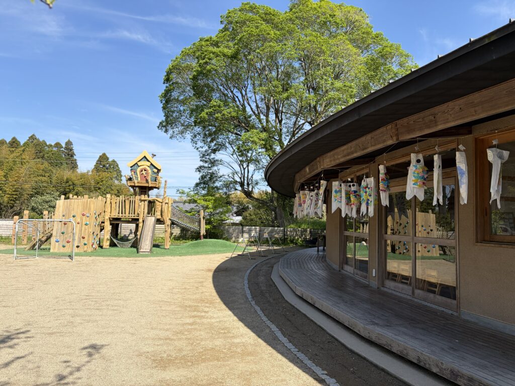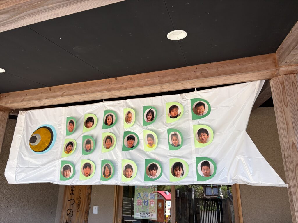 生命力の強い鯉のように「元気に大きく育ってほしい」と願いを込めてこいのぼりを制作しました。玄関には思いっきり笑顔をのせた大きなこいのぼりが、子どもたちの登園をお迎えし、テラスにはそれぞれ思い思いのこいのぼりが今年も元気に大空を泳ぎます。