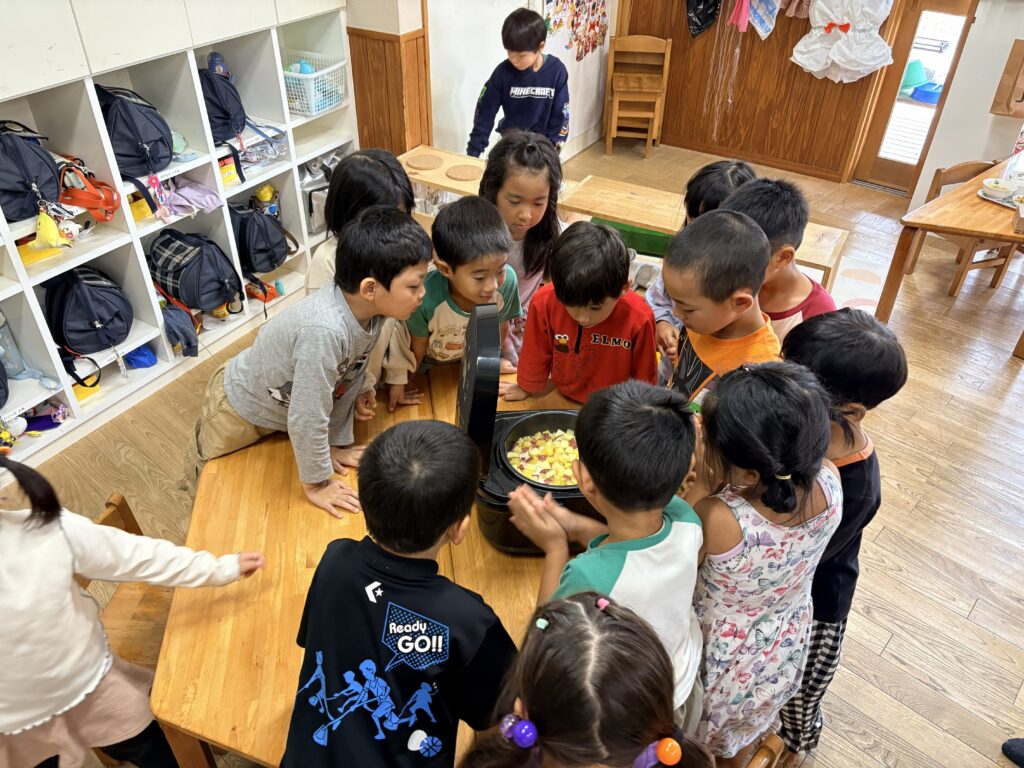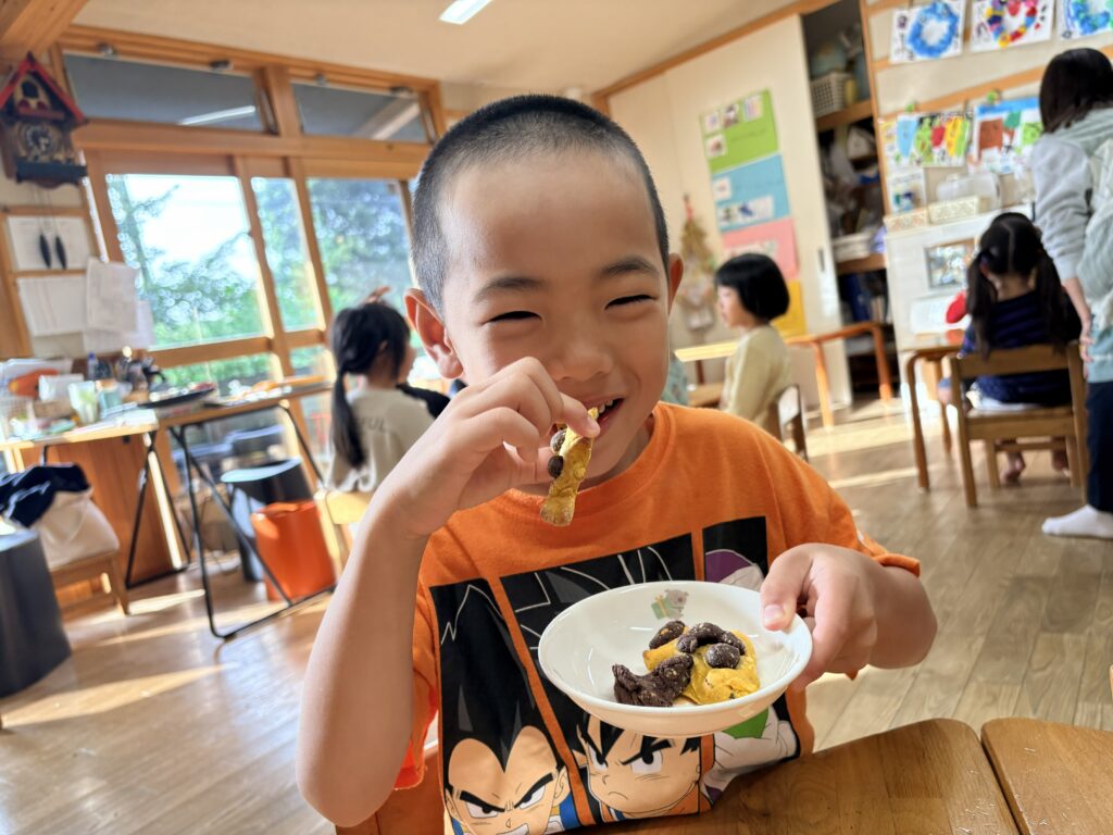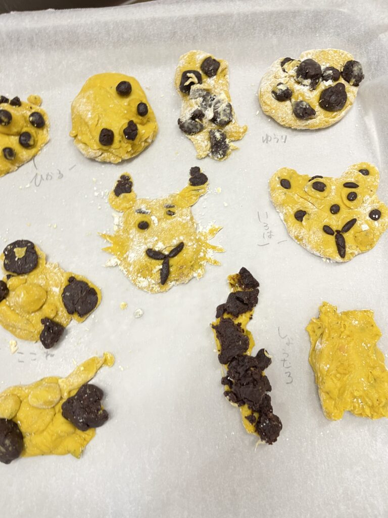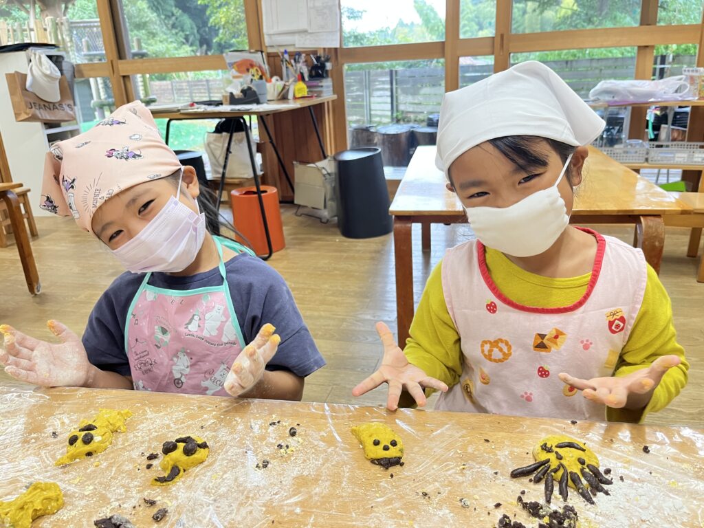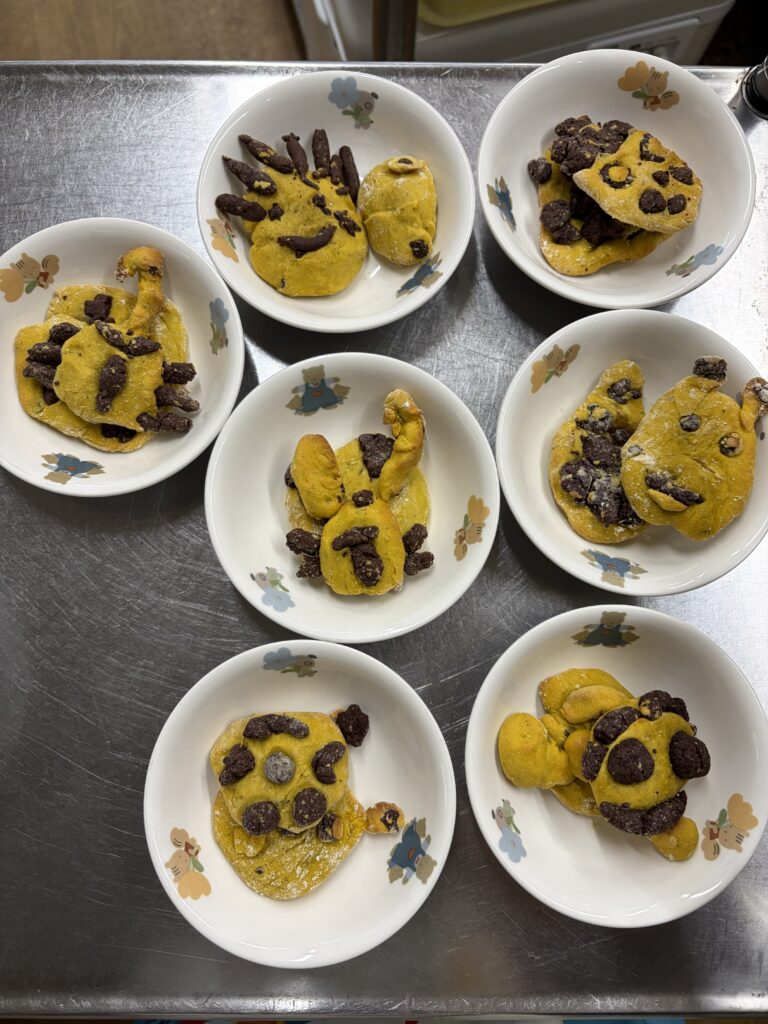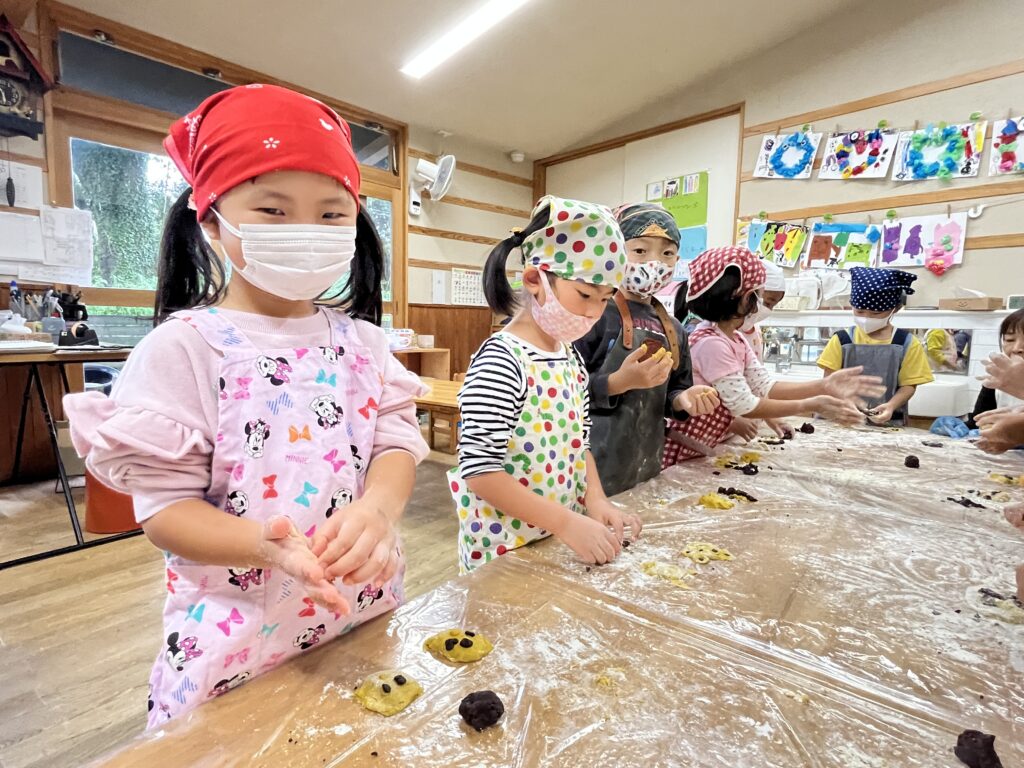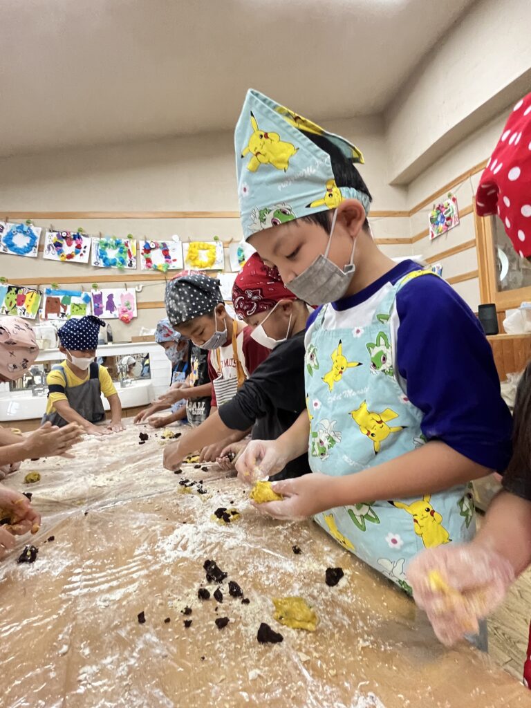 『クッキング』 先日、園の畑でとれたお芋で「お芋ごはん」を作りました。自分たちでお米を研ぎ、お芋と塩を入れて炊飯しました。いつものご飯の炊きたてのいい匂いにお芋の匂いがプラスされ、旬の香りを感じることができました。クッキー作りでは、カボチャとココアが練りこんである2つの生地で形を作っていきました。なかなか難しいようでしたが、0.1.2歳児のお友だちのおやつもかわいく作ってくれました。美味しかったね。