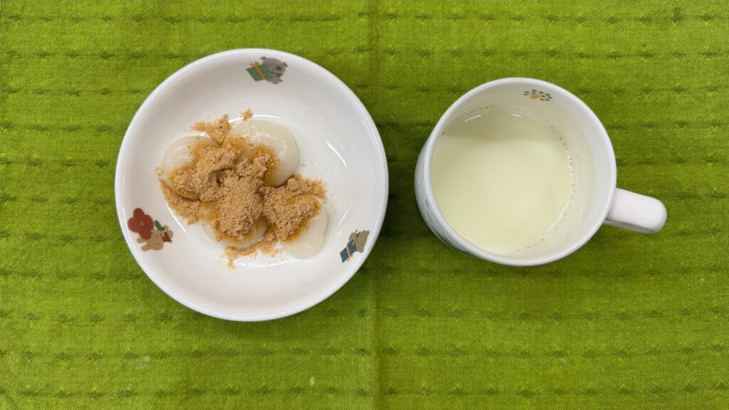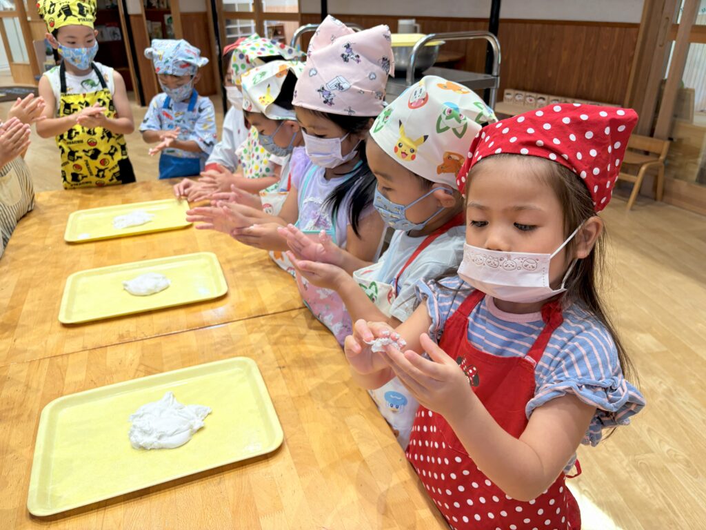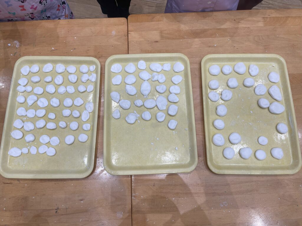 『中秋の名月』 今日は中秋の名月ですね。中秋の名月とは、秋の真ん中の夜に見える、一年で最も美しい月の事です。秋の収穫に感謝を美しい月に祈る日とも言われています。供えられる「月見団子」をきりん(4.5歳児)組が作りました。「やわらかい」「ふわふわする」と言いながら丸めました。おやつは「お月見団子」今夜、綺麗なお月様が見えますように・・。