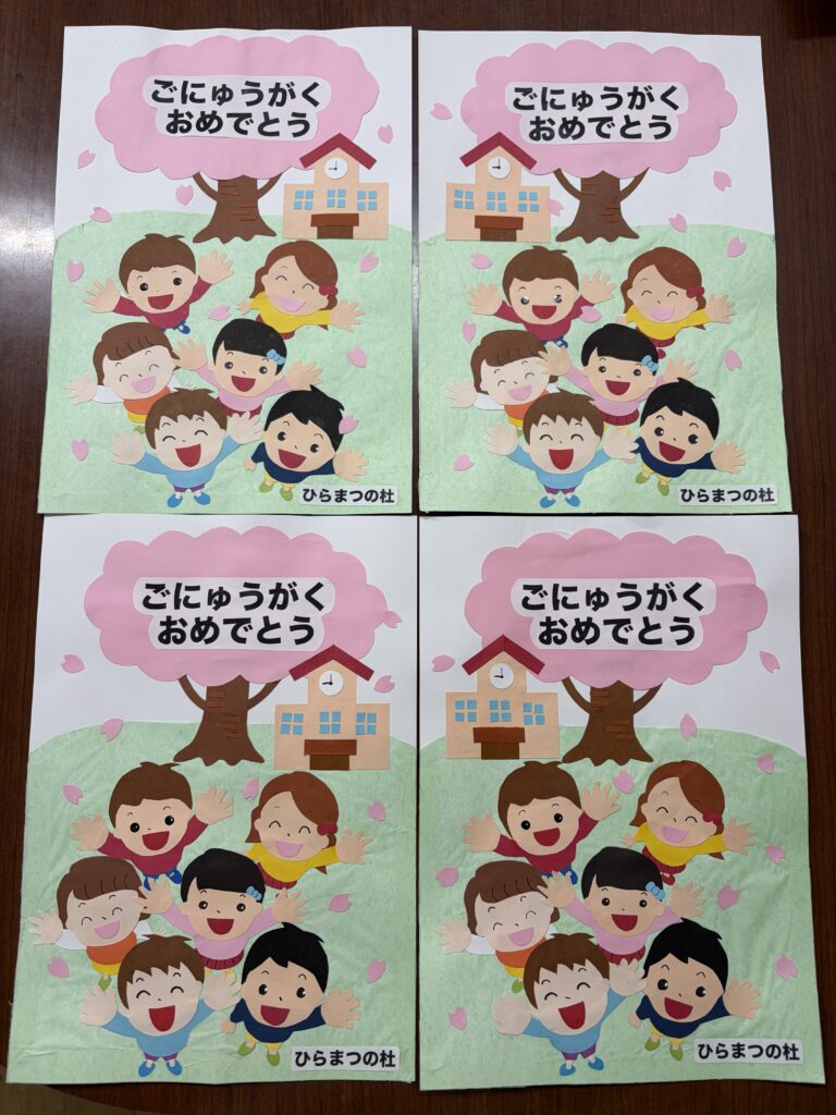 3月14日に卒園した子どもたちが今日、小学校に入学しました。職員から「おめでとう」の気持ちを込めて、小学校(4校)に ”お祝いカード”を届けました。ぴかぴかの1年生!お友だちがたくさんできますように!ご入学おめでとうございます。