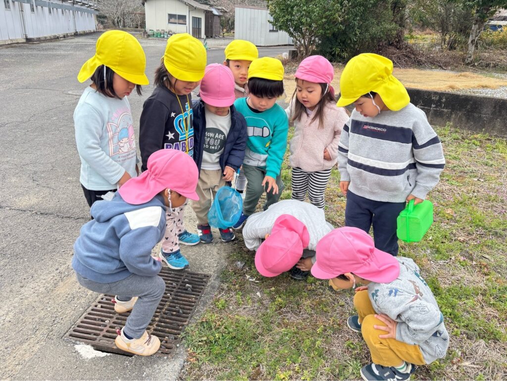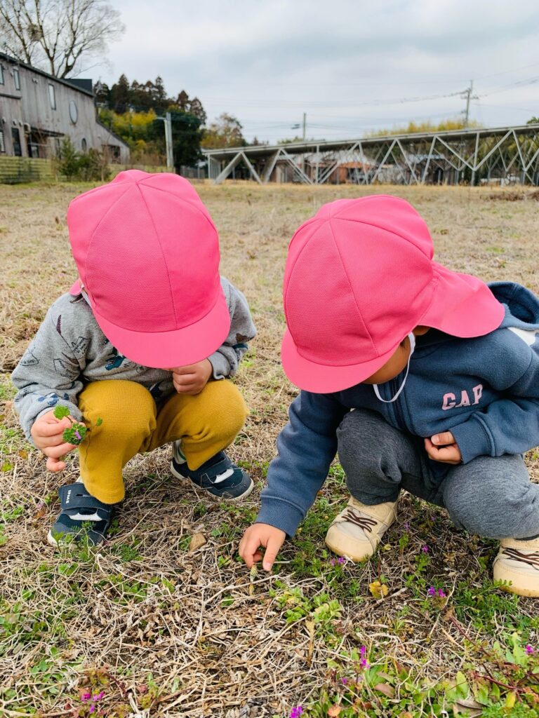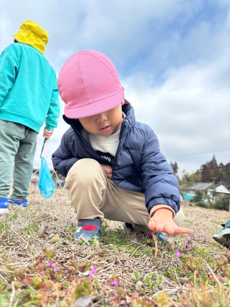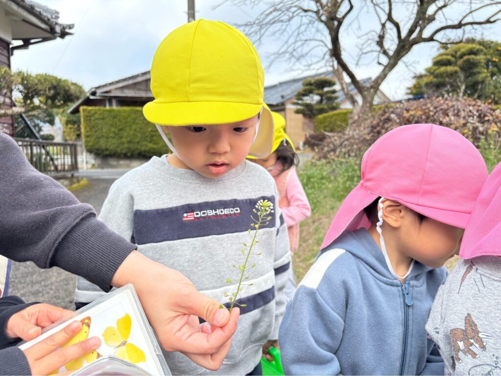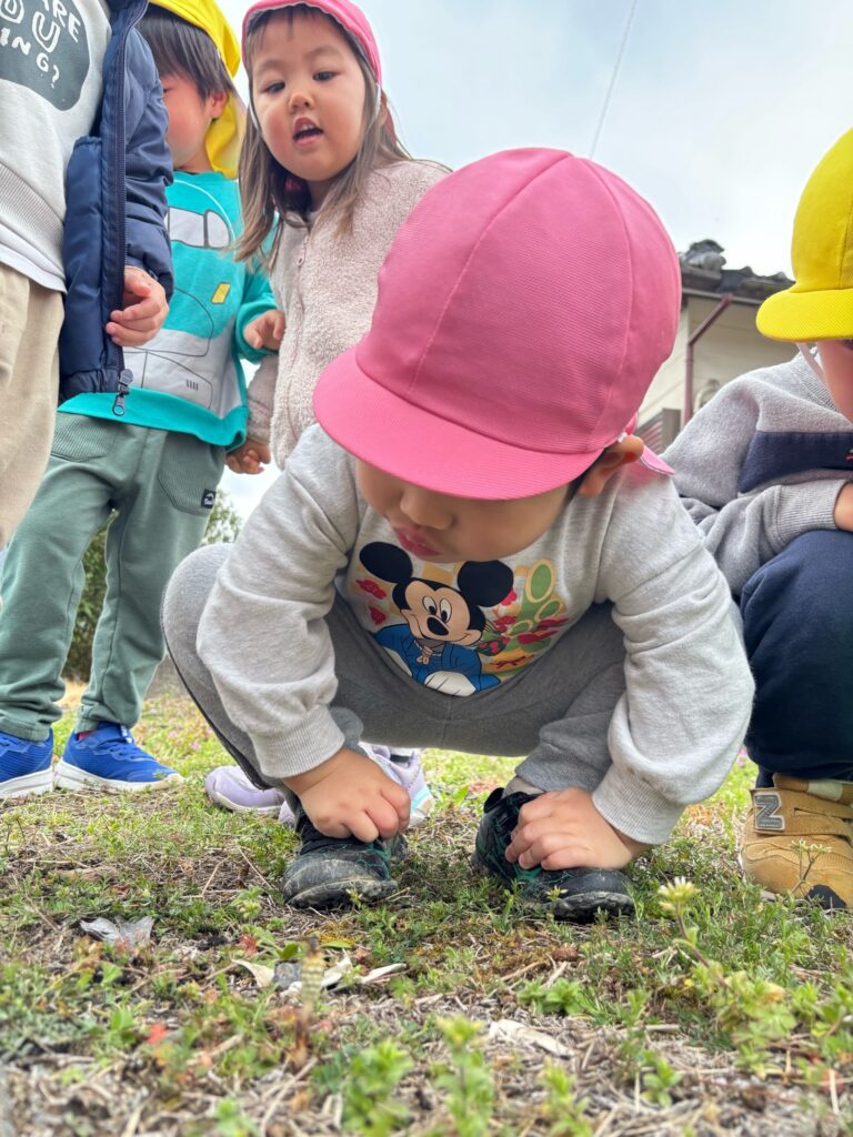 『小さな春』 小さな春を見つけに、うさぎ組(2歳児)さんとりす組(3歳児)さんがお散歩に出かけました。原っぱで土の中からひょっこりと顔を出した小さなつくしを発見!「つくしの赤ちゃんだね」とみんなで観察しました。「もう少し大きくなってから取ろうよ」と優しいお友だちの言葉にみんな納得し、そっと見守ってくれていました。菜の花やナズナも暖かな陽気に誘われて顔を出していました。たくさんの春に出会えますように。