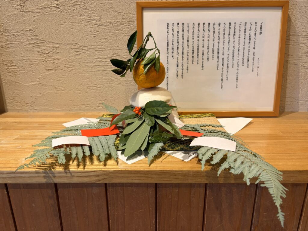 『年の瀬』 お部屋やいつも使っている机や椅子をきれいにし、1年の汚れを落とし新しい年を清らかな気持ちで迎えるため大掃除をしました。「鏡餅」は新年に家へ訪れる年神様の依り代とされ豊作・健康・幸福を願ってお供えします。無事に年越しができますのも、保護者の皆様をはじめ多くの皆様の温かいご協力のおかげで心から感謝申し上げます。ご家族お揃いでよいお正月をお迎えください。来る2026年が皆様にとってよい年になりますようにお祈りします。