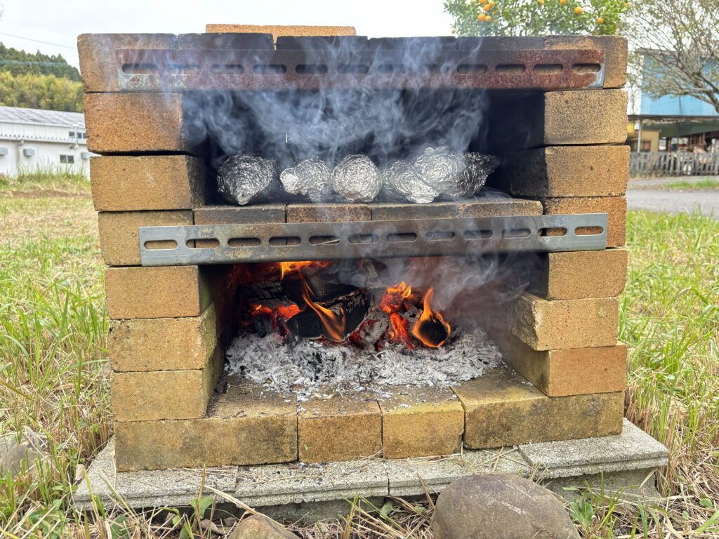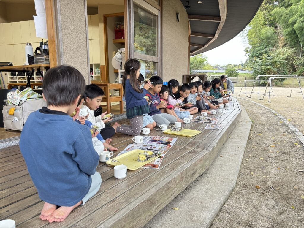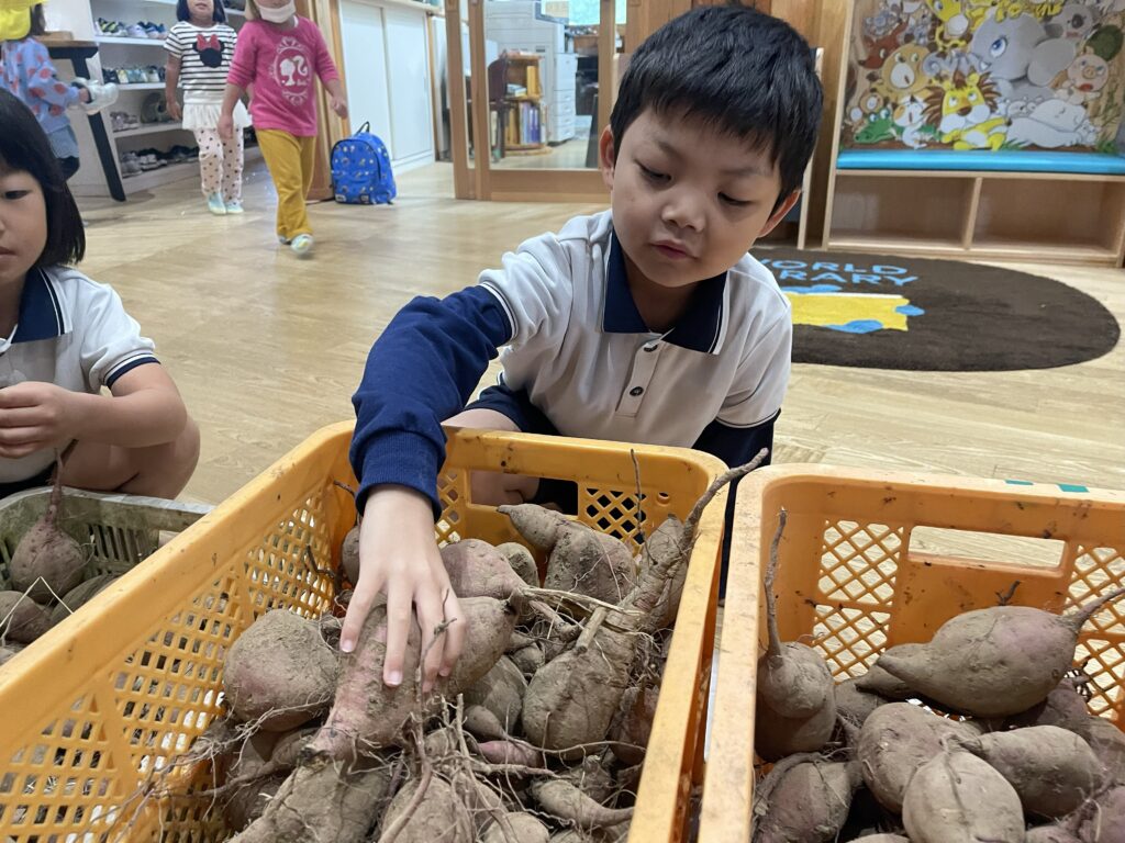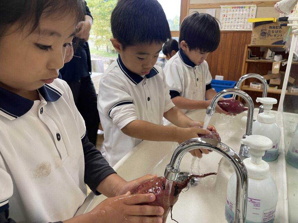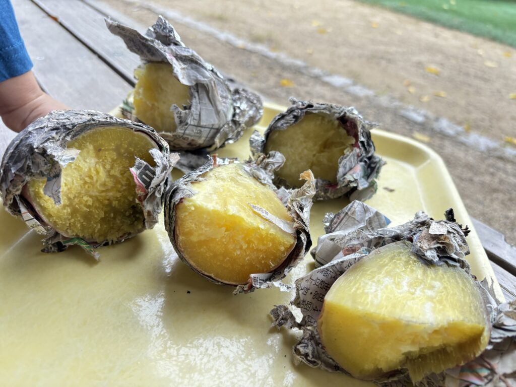 園で収穫したさつまいも。お芋ご飯、芋の天ぷら、スイートポテトでいただきましたが、今日は「焼き芋」に変身です!子どもたちがお芋を選び、水で洗って、新聞紙でくるんだ後に、水に浸け、アルミホイルで巻きます。それから、園の窯でじっくりじっくりと火を入れ、お芋の良い匂いがしたら、出来上がりです。みんなで出来立ての焼き芋をフーフーしながら食べました。蜜がたっぷり美味しい焼き芋でした。