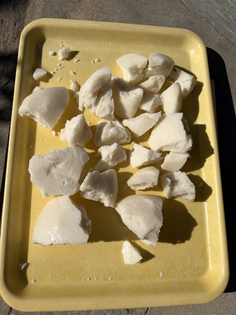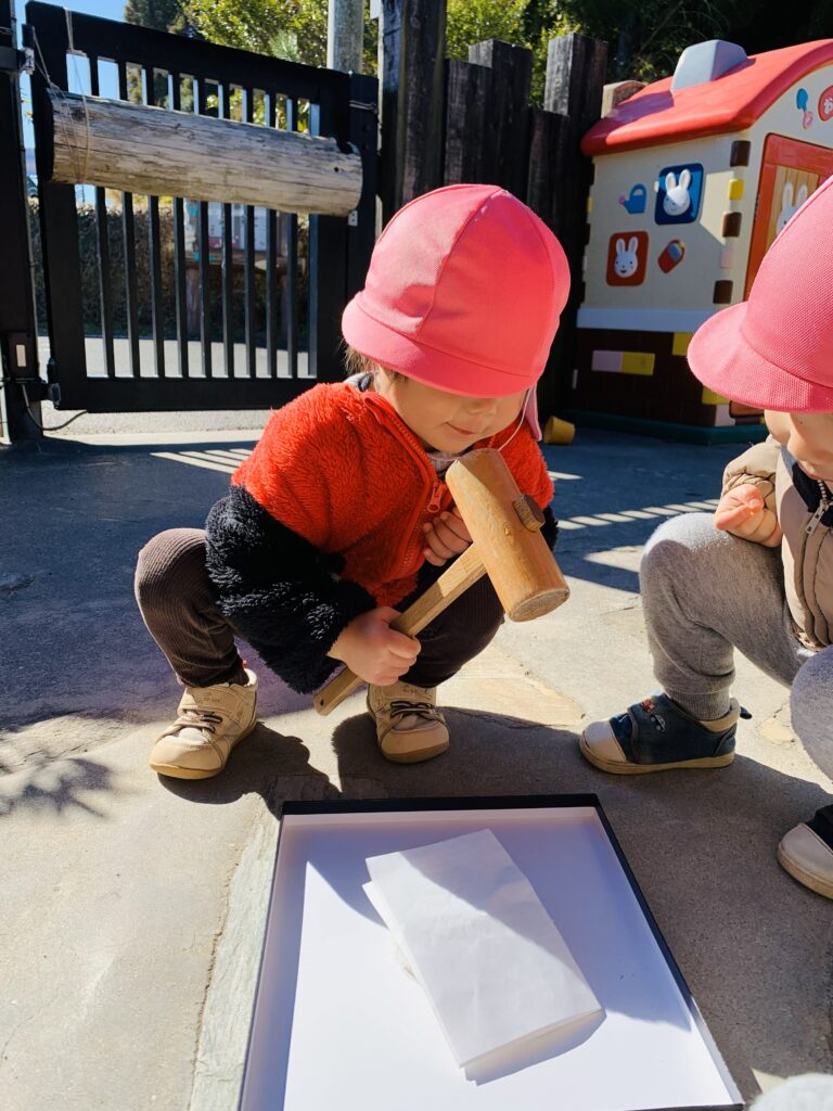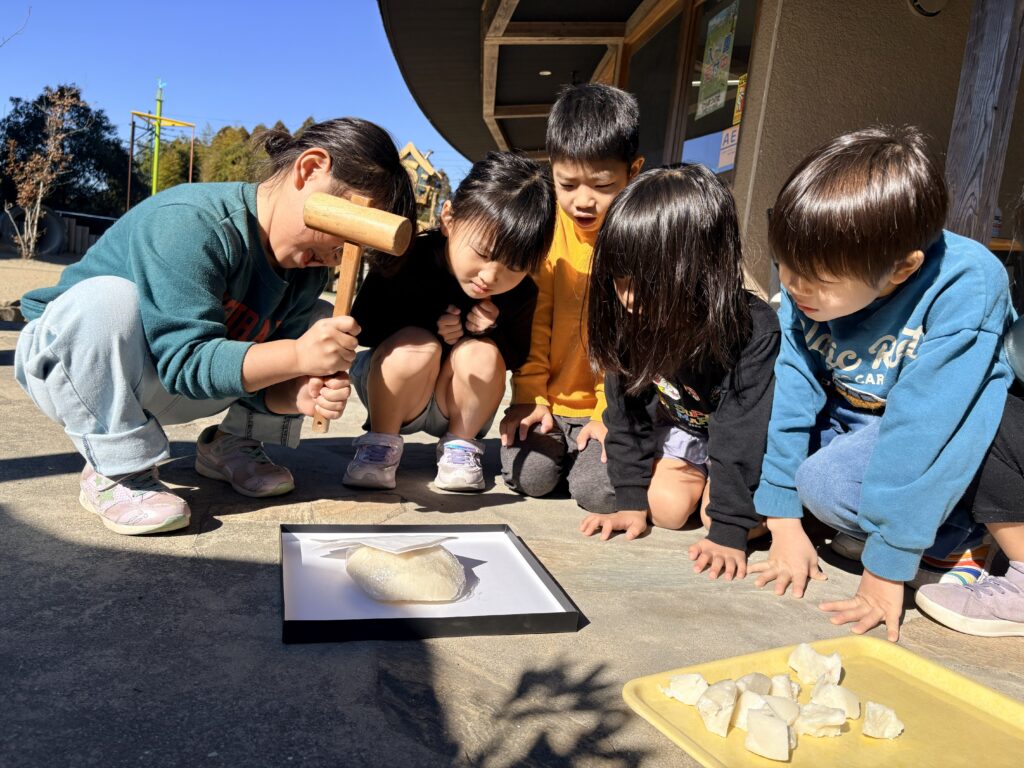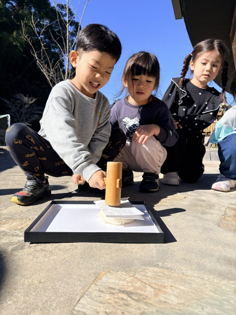 お正月に年神様にお供えしていた鏡餅を下げ、割って食べる昔からの日本の習慣、鏡開き。刃物を使わずに開きそのお餅を食べ、年神様の力を分けていただき、無病息災を願うという昔からの言い伝えです。みんなで力を合わせ、木槌で鏡餅を小さくしました。おやつのぜんざいでいただきます。
